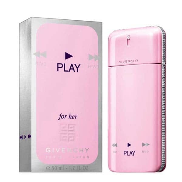 عطر ادکلن جیوانچی پلی زنانه-Givenchy Play for her، که توسط Lucas Sieuzac خلق و توسط مدل کاندایی به نام Noot Sear تبلیغ شد، با رایحه ای شیرین و گرم برای مصرف در طول روزهای خنک بهاری و یا میهمانی های خودمانی پیشنهاد می شود . بطری این عطر درست همانند ورژن مردانه اش مثل یک MP3 Player با دکمه هایی بر روی آن موجود می باشد . رایحه ی غالب آن هلو و شکوفه ی پرتقال و دسته ای از گل های رنگارنگ نظیر ارکیده ، یاسمن ، طائف و مگنولیا است .